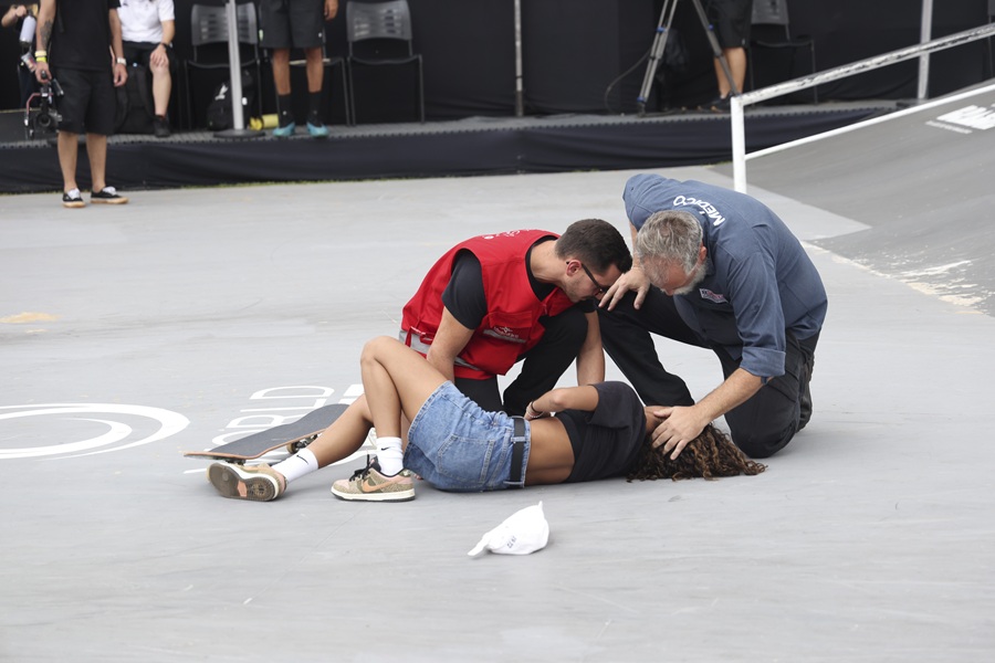 Rayssa Leal sendo atendida após queda – Foto: Leco Viana